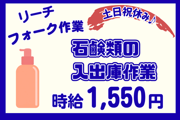 日用品を取り扱う常温倉庫。 ピッカーフォークリフト出荷作業を行います。ケースピック、荷合わせ。 【通勤手段について】 無料駐車場完備、マイカー・バイク通勤OKです。 【服装について】 ヘル…
