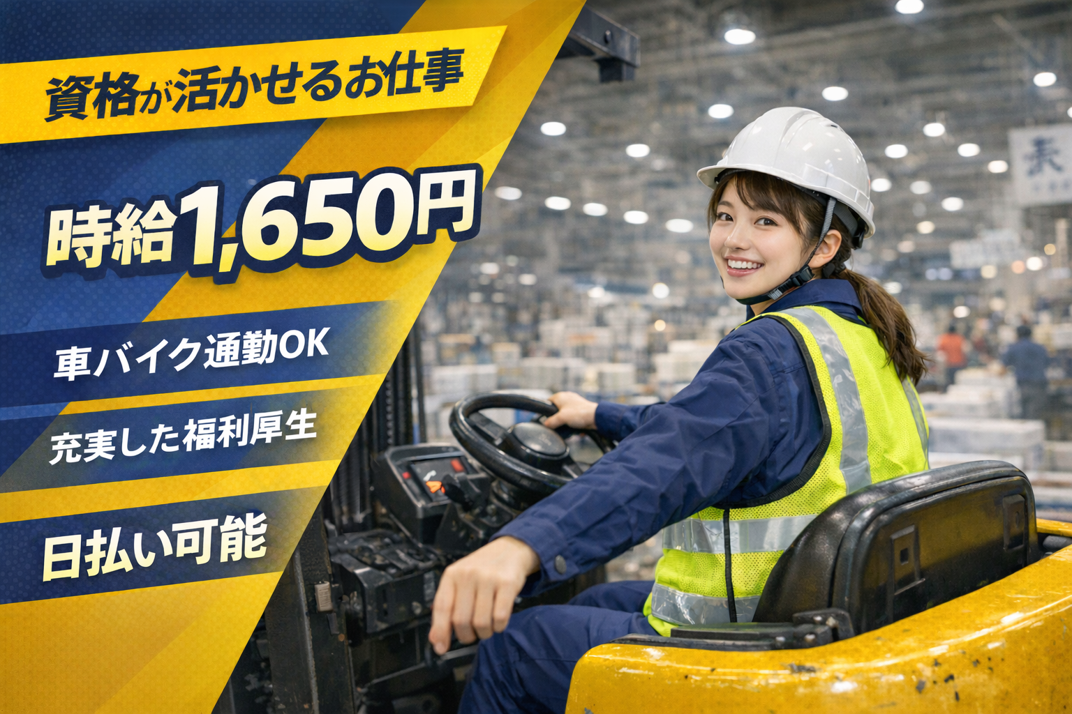 【仕事内容】 豊洲市場で1.5トン車バッテリー式のカウンターフォークリフトを使用して入出荷作業。積み下ろしやパレット単位での搬送、出荷に合わせた加工作業も携わります。カウンターフォークリフトの乗車率は6割で残業は基本ありません。尚、休憩時間に入るタイミングは多少前後する可能性はあります。 ~1日の仕事の流れのイメージ~ 18:00 - 22:00 入出荷 積み下ろしや搬送 22:00 - 23:00 休憩 23:00 - 以降 入出荷 積み下ろしや搬送 加工作業 現場スタッフの方々が丁寧にお教えしますのでどうぞご安心ください。周りの先輩スタッフや社員、もちろん私たち営業窓口も全力でサポートいたします。あなたのスキルをここで活かしませんか? |